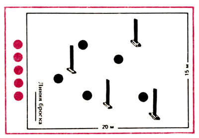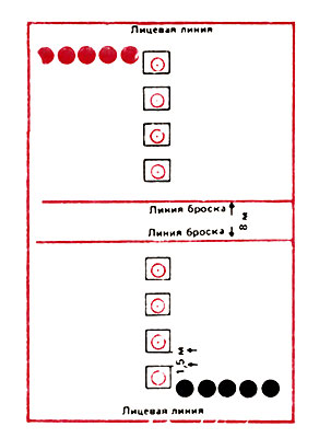 Разновидность. Эта разновидность игры предназначена для 14-18-летних. Построение - то же, что и в предыдущей игре, но расстояние между шеренгами увеличивается до 60-100 м. Кроме того, добавляются две линии, каждая на расстоянии 5-10 м от лицевой линии (от линии «домов»). Эти линии ограничивают нейтральную зону у каждой команды.
