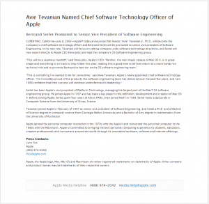 Այն բանից հետո, երբ Apple-ը գնեց NeXT-ը , Է. Թևանյանը, որը Apple էր եկել Սթիվ Ջոբսի հետ, գլխավորեց ծրագրային տեխնոլոգիաների բաժանմունքը և գլխավորեց այն մինչև 2003 թ. հուլիսը։ 2003 թ. Ավետիս Թևանյանը դարձավ Apple computer-ի ծրագրային ապահովման մշակմանգծով փոխնախագահ։ Նրա նախկին պաշտոնը զբաղեցրեց Բերտրան Սերլետը՝ Թևանյանի ենթական և գործընկերը դեռ 1989թ-ից NeXT-ի ժամանակներից։