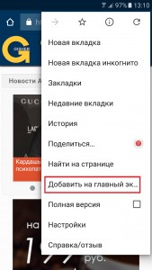 В браузере Chrome Mobile, как и практически в любом другом браузере, существует опция добавления на главный экран.