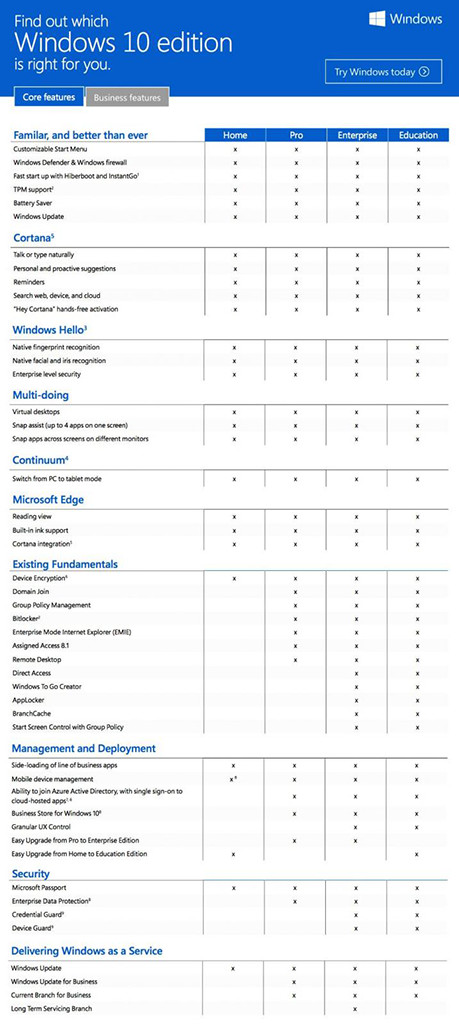 Финальная версия Windows 10 будет доступна в четырёх основных редакциях: Home, Pro, Enterprise и Education.
