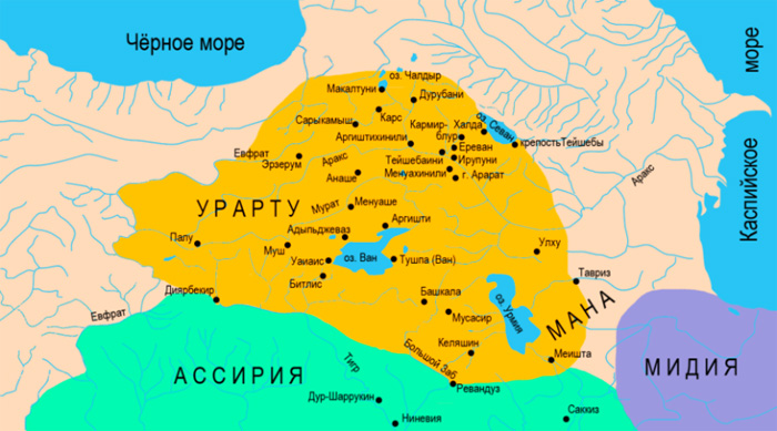 Походы Саргона II против УрартуВ 722 году до н. э. к власти в Ассирии пришёл более решительный и воинственно настроенный Саргон II, младший сын Тиглатпаласара III. Саргон II сверг с престола своего старшего брата Салманасара V и был настроен вернуть Ассирии былое могущество. В 722—719 до н. э. годах Саргон II был занят военными действиями на западе — в Сирии и Палестине, а с 718 года до н. э. перенёс военные действия на север. Действия Саргона II всегда были тщательно подготовлены, в его резиденции, Дур-Шаррукине, сохранились клинописные таблички с систематическими разведывательными донесениями из Урарту. Разведывательным данным придавалось такое значение, что ответственным за донесения из Урарту был назначен сын Саргона II, Синахериб, который в последствии стал царём Ассирии. С 718 по 715 годы до н. э. Саргон II и Руса I не решались вступить в прямые сражения. Их борьба развернулась на территории страны Манна, лежавшей к востоку от озера Урмия. Несколько раз за этот период Саргон II захватывал страну маннейцев и сажал на престол угодного ему царя, а Руса I в ответ организовывал восстание маннейцев в пользу царя лояльного Урарту. Наконец в 714 году до н. э. Саргон II выступил с тщательно подготовленным походом против Урарту, сразу после получения донесения о неудачном военном походе Русы I против киммерийцев.