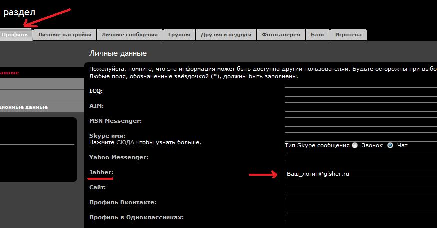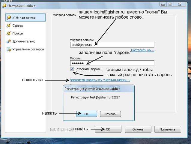 логин@jabber.gisher.ru, пароль любой какой хочешь, снизу будет, зарегистрировать эту учётную запись, напишет об успешной регистрации, затем можешь уже просто подключится