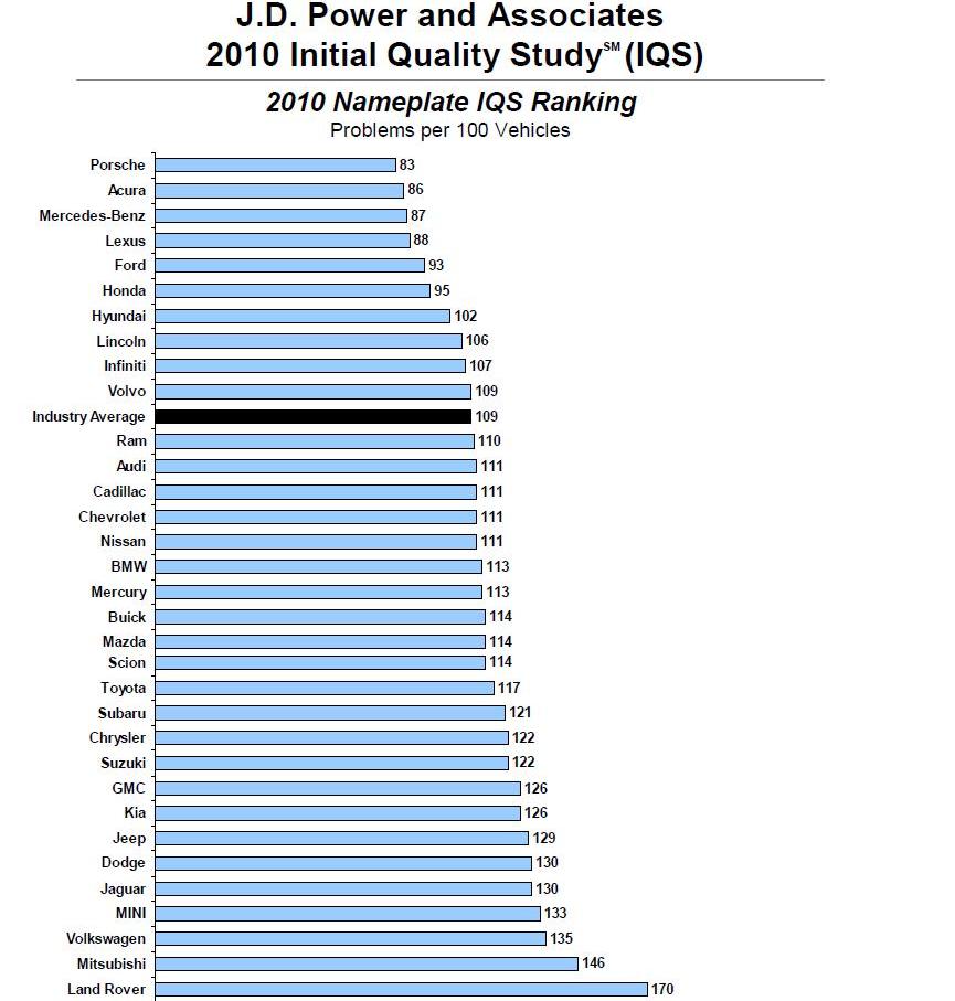 По результатам последнего исследования, обнародованного 17 июня 2010 года, общее качество новых автомобилей за прошедший год практически не изменилось: в среднем по индустрии было выявлено 109 проблем на 100 новых машин по сравнению с 108 в 2008 году. За последнее же десятилетие наблюдается постепенное уменьшение технических неисправностей в новых машинах, как американских, так и европейских и японских.