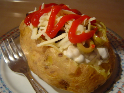 В состав ходит болшая картошка в духовке ,по вкусу (бывает очень острым,сыр,всякие зелени,оливки,сосиски,столичный салат,вообщем всё что найдёстя)примерно солянка в сухом виде.