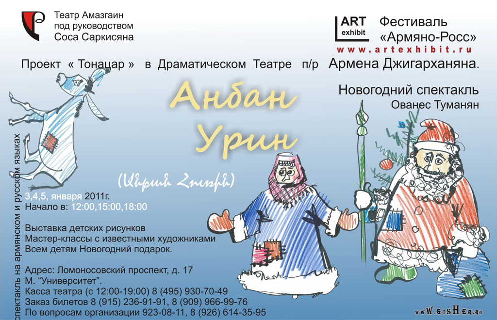 “АртЕкзибит” и Государственный армянский театр “Амазгаин” под руководством Соса Саркисяна в рамках Фестиваля «Армяно-Росс» представляют новогодний детский проект «Тонацар» (Елка). Целью этого проекта является духовное воспитание общества, а особенно детей.