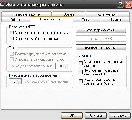 2. Откроется меню архивирования. Переходим на вкладку «Дополнительно» и нажимаем на кнопку «Установить пароль» (см. фото).