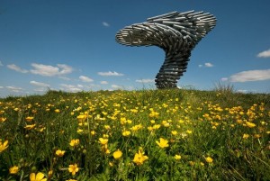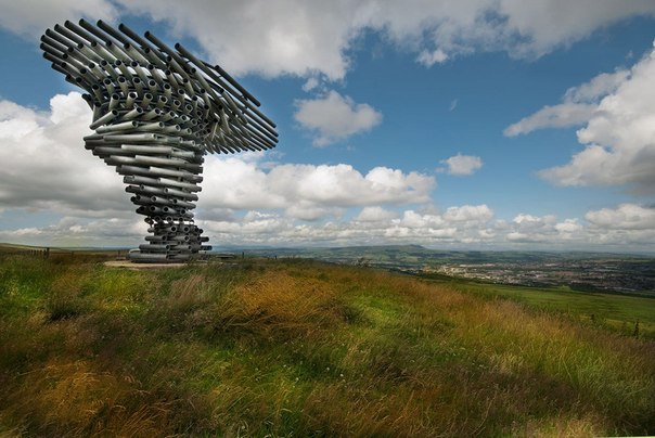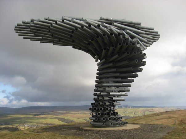 Высоко в горах недалеко от английского г.Бернли, можно увидеть необычную конструкцию, сделанную из металлических труб. Это поющее дерево, которое постоянно звучит при дуновении ветра, имеет высоту более 3 метров. Трубы закрутили по спирали, тем самым придав дереву более эффектный вид. Звук постоянно меняется, потому что трубы уменьшаются к основанию дерева-органа.