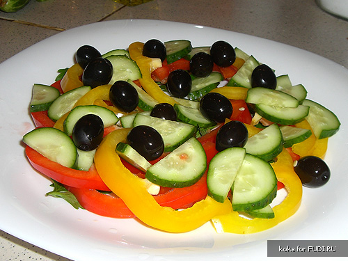 Режем маслины на 4 части и сверху укладываем на салат. салат убрать в