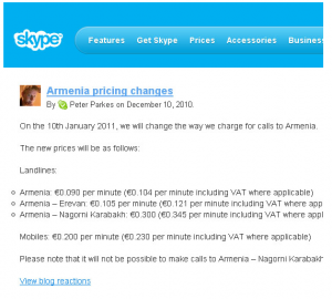 20 декабря, азербайджанский информационно-развлекательный портал day.az обратился к соотечественникам с призывом направить в компанию Skype письма с жалобами. Азербайджанцам не понравилось то обстоятельство, что на официальном сайте Skype тарифы Нагорно-Карабахской Республики указаны вместе с тарифами Армении, более того – Skype позволяет звонить в НКР.