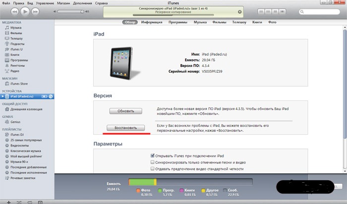 Если после этого, iPad не включился, а просто завис на яблоке, то необходимо восстановить iPad через iTunes.